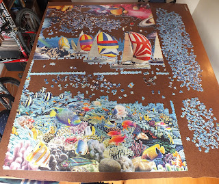 EliminarThe sailboats were the easiest, by far. I thought the fish were gonna be cruel, but they surrendered easily. In general I haven´t felt like it has been hard. I guess that with the previous experience of putting sections 1 and 2 together has given me a, how can I say, "knack" or something. Sorting has been crucial. I spent much more time sorting out the pieces, getting the stars in one place, for example, and putting all the pieces that resembled sea in another place. Yeah, sorting much more thoroughly than before has done the trick.